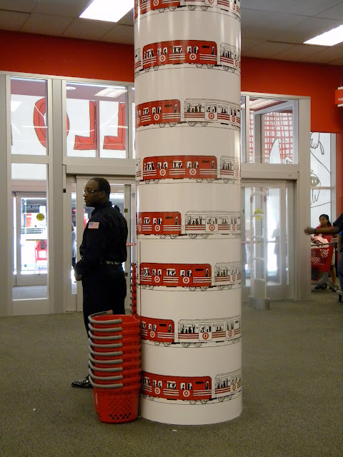 Everything from their printed ads, t-shirts of guys handing out the metro on the morning commute, to poles in the front part of the store, to a fully encapsulated 6 train (check out this article, Target paid $250,000 to cover no.6 trains for 6 weeks!!), all of it is drawn.
