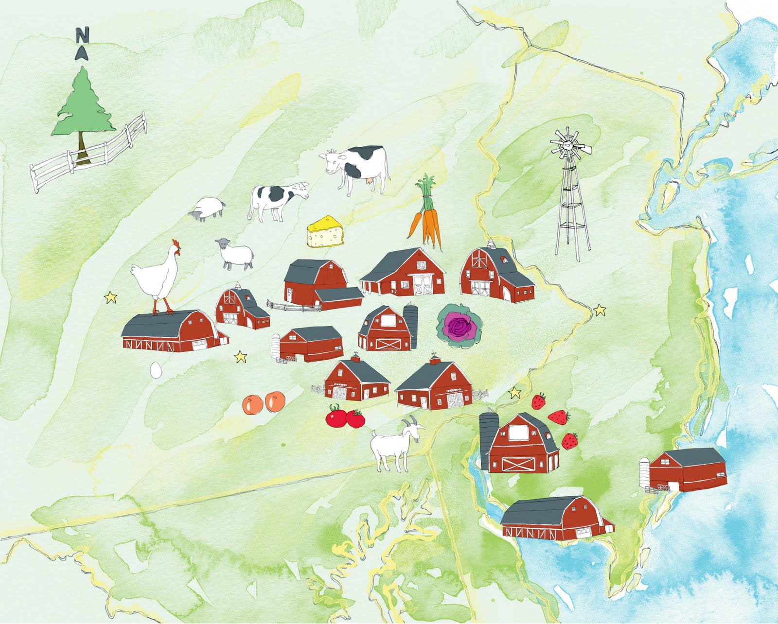 I was asked last week by Leigh of Leigh Rubin Design, to help illustrate a map. The map will be used on a restaurant's website. Theme of the restaurant is "farm to table," so I was asked to incorporate different animals raised and crops produced at each respective farm.