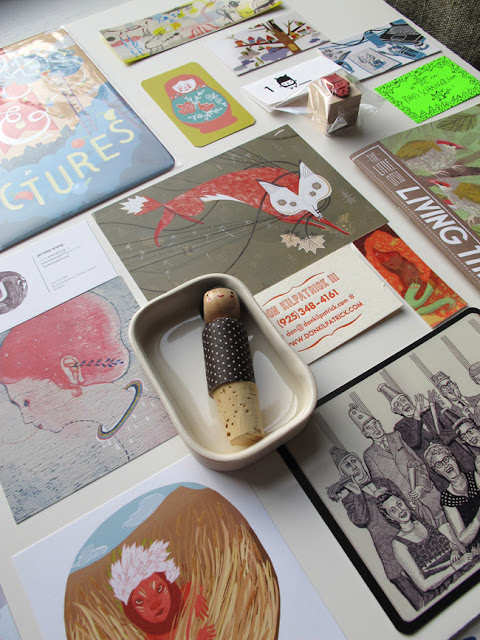 I laid out all the great cards, prints, items, etc. that I acquired that weekend. Really, my peers are so talented! So here they are!