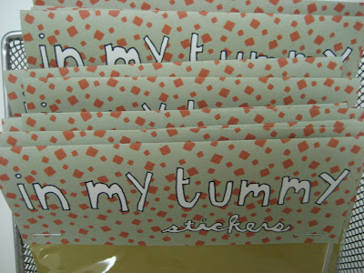 'In My Tummy' Stickers I finished with the sticker project this week. It took a while to assemble each set and cut out the stickers. They will be on sale at my reception TOMORROW :) for $5.00. Pick up a set for yourself or a friend or even both!