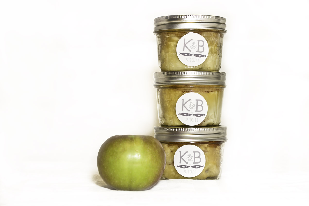 One of those details, was the wedding favor. My sister and my mom made 160+ homemade apple pies as the wedding favors (Yes, really, they made 160 pies over 2 days of baking. And yes, they were delicous!). So, I designed a sticker for their jars that had their wedding logo incorporated.