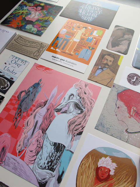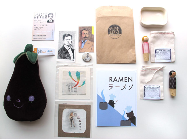 I laid out all the great cards, prints, items, etc. that I acquired that weekend. Really, my peers are so talented! So here they are!