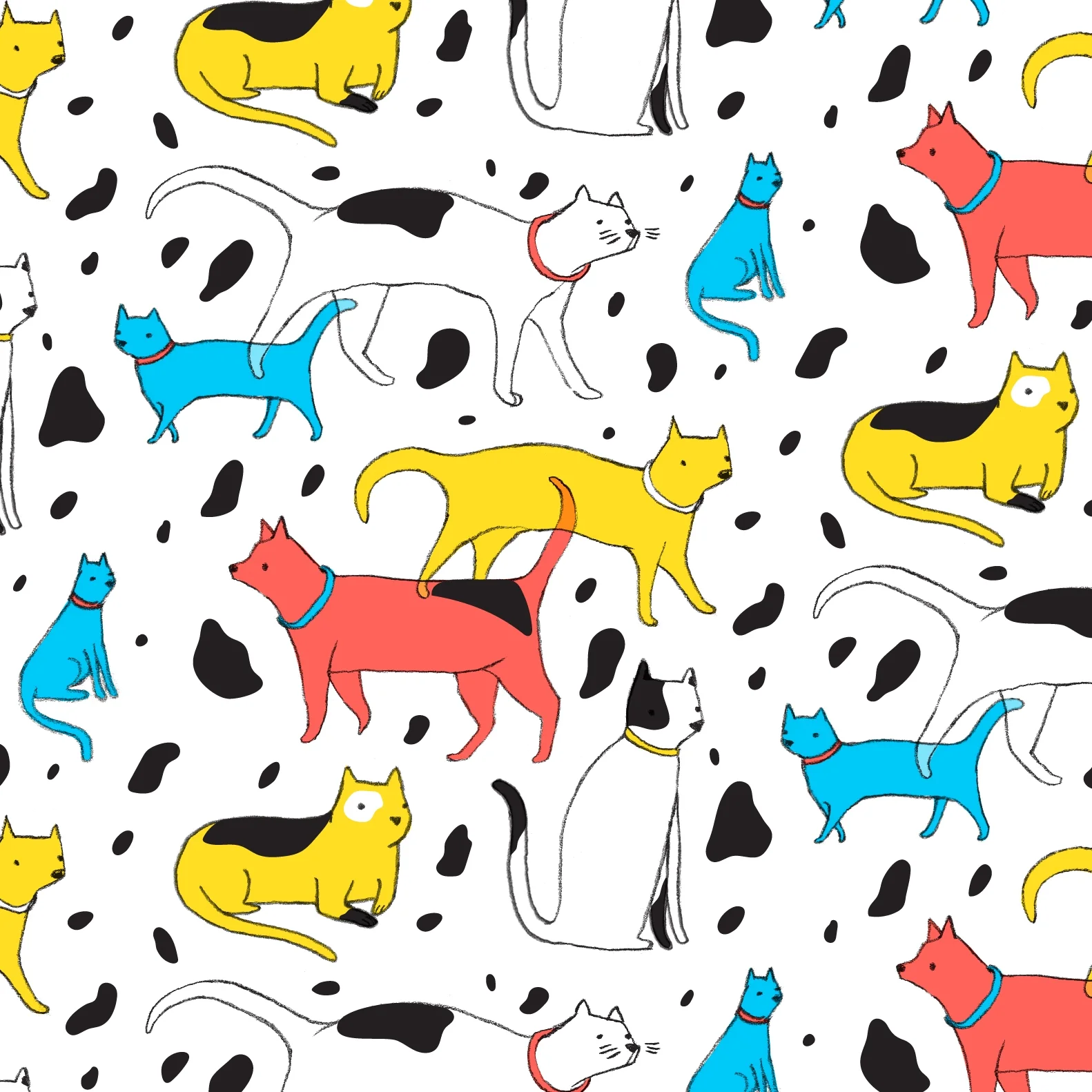 A pattern inspired by primary colors, black and white, animal prints, and of course, cats! Email me if interested to license.
